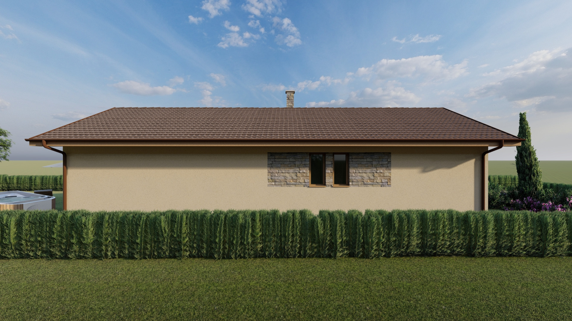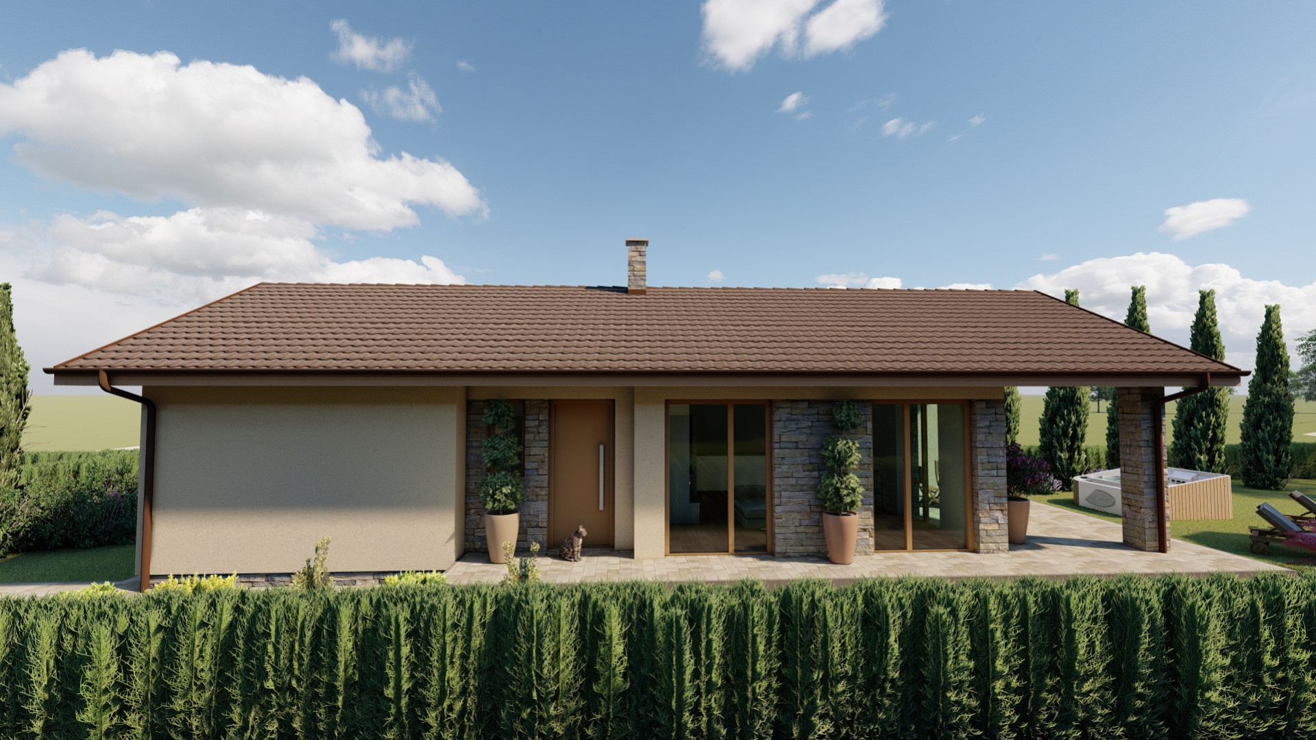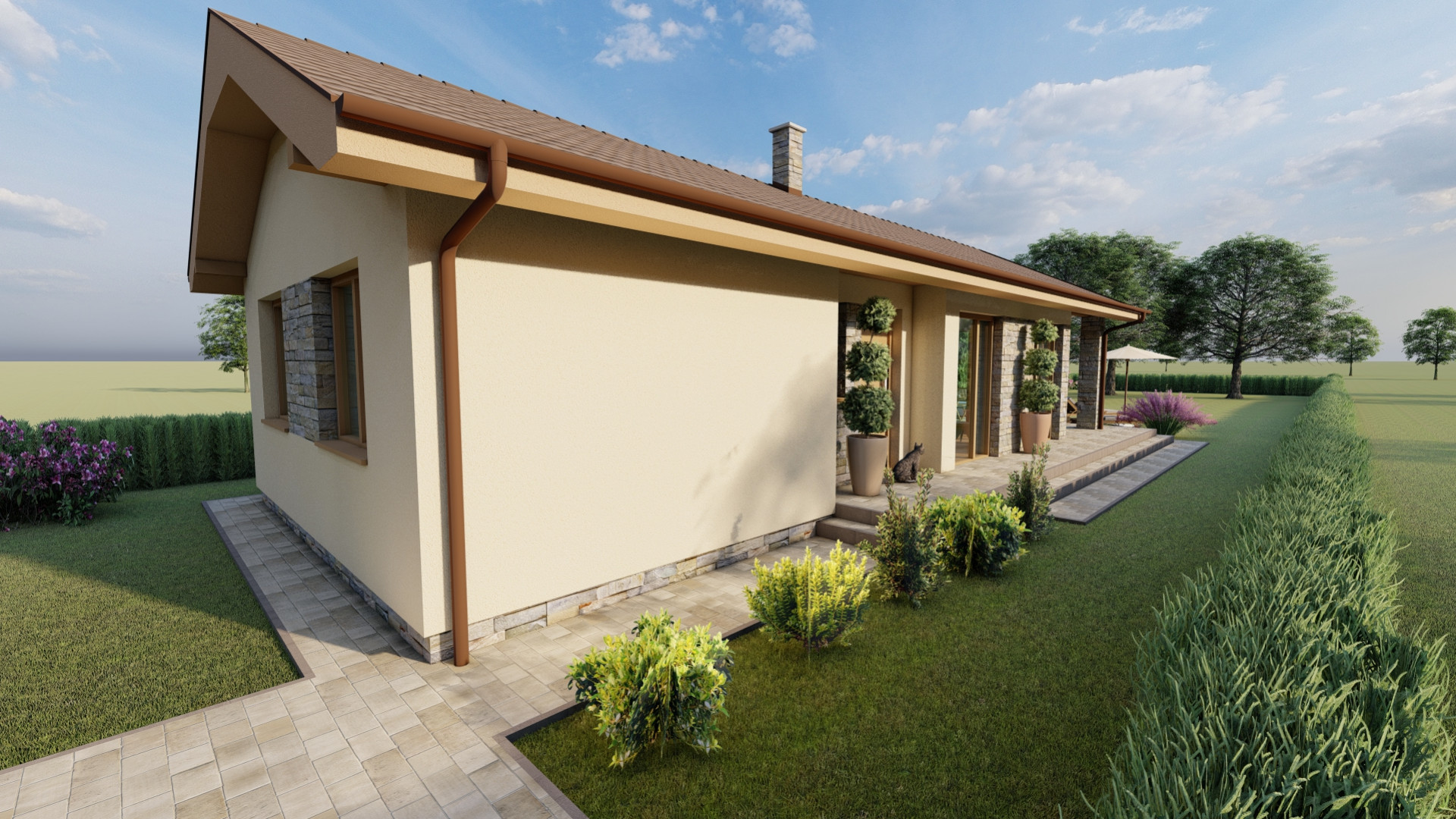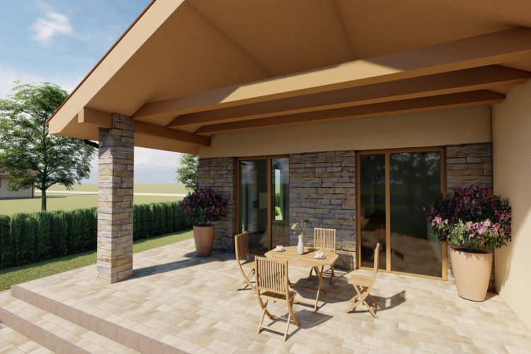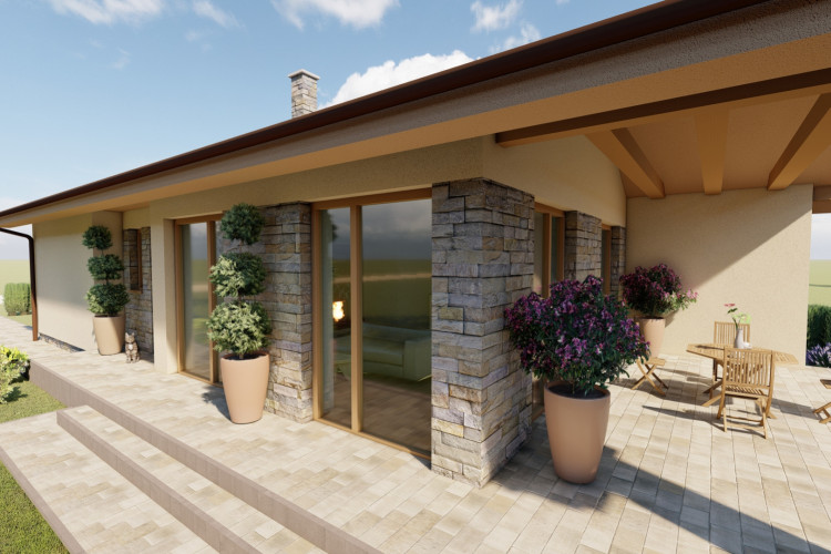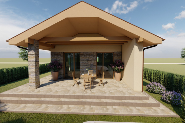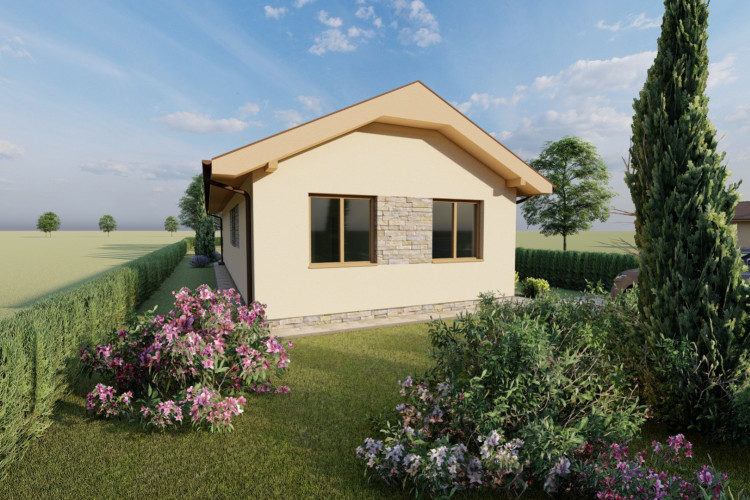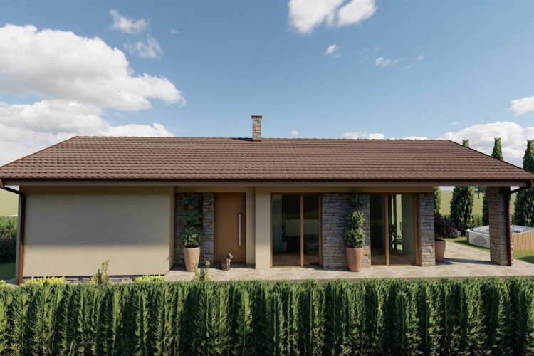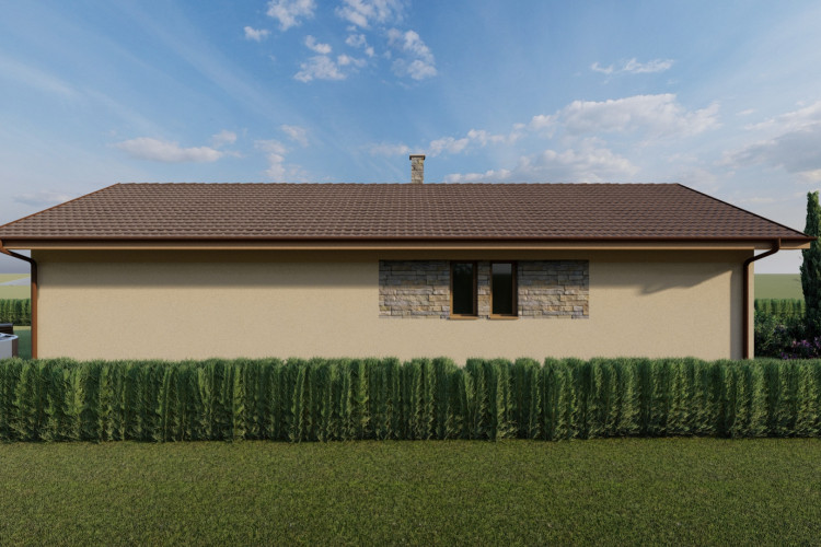 Jednoduchý malý prízemný rodinný dom určený prevažne na rovinatý terén, ktorý spĺňa nároky na bývanie pre troj až štvorčlennú rodinu. Kompaktný obdĺžnikový pôdorys s plnohodnotným príslušenstvom je vhodný aj na menšie pozemky. Hlavný vstup do rodinného domu je z bočnej strany, na ktorý nadvezuje zádverie a chodba. Verejnú časť tvorí presvetlená obývacia izba spojená s kuchyňou, a terasou. Súkromnú časť tvoria 2 obytné izby a kúpeľňa. Zastrešenie domu tvorí sedlová strecha so sklonom 25 stupňov.