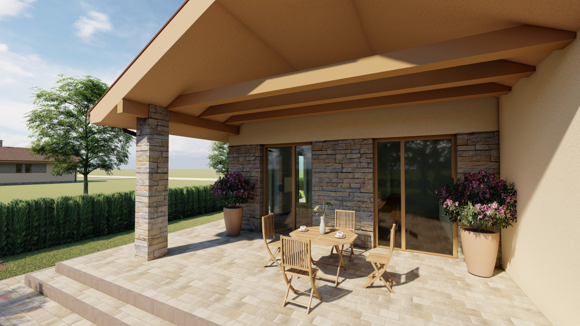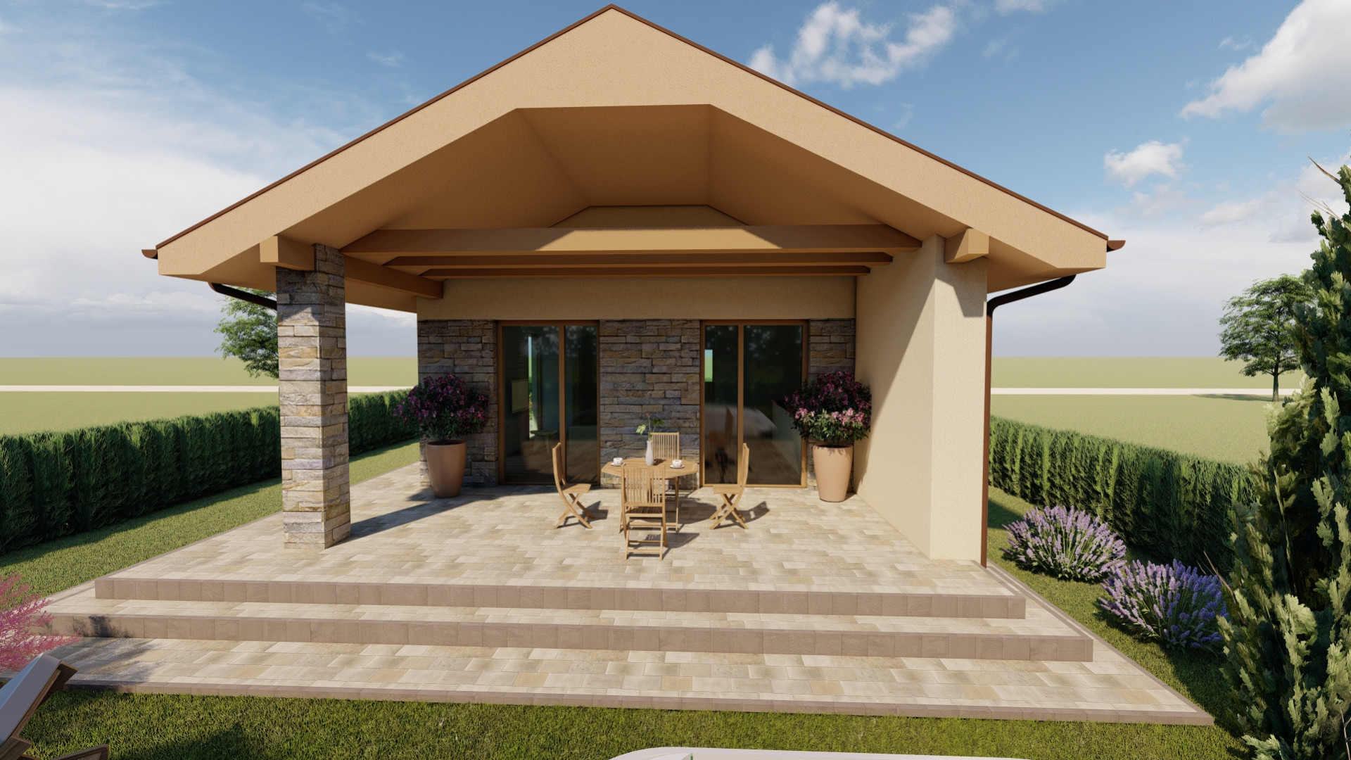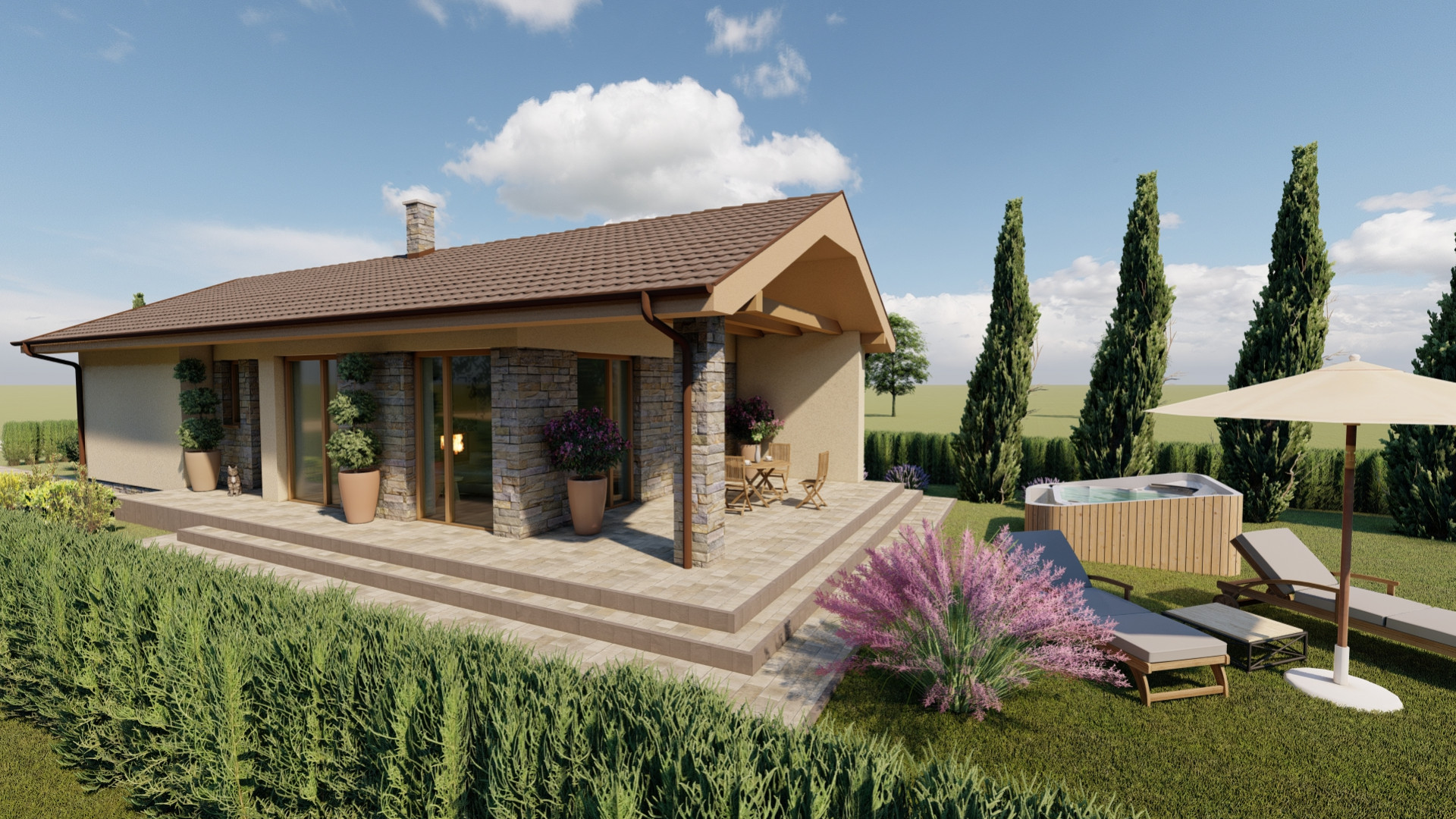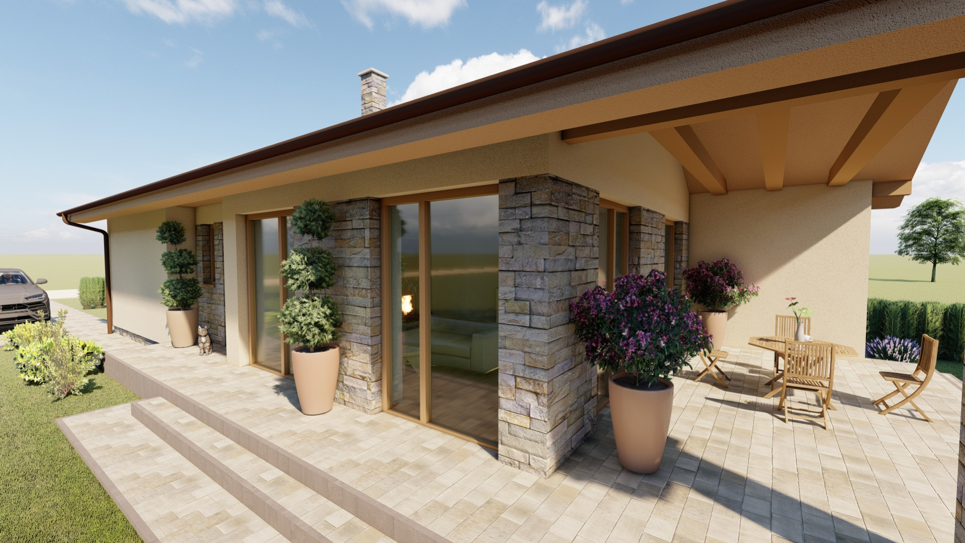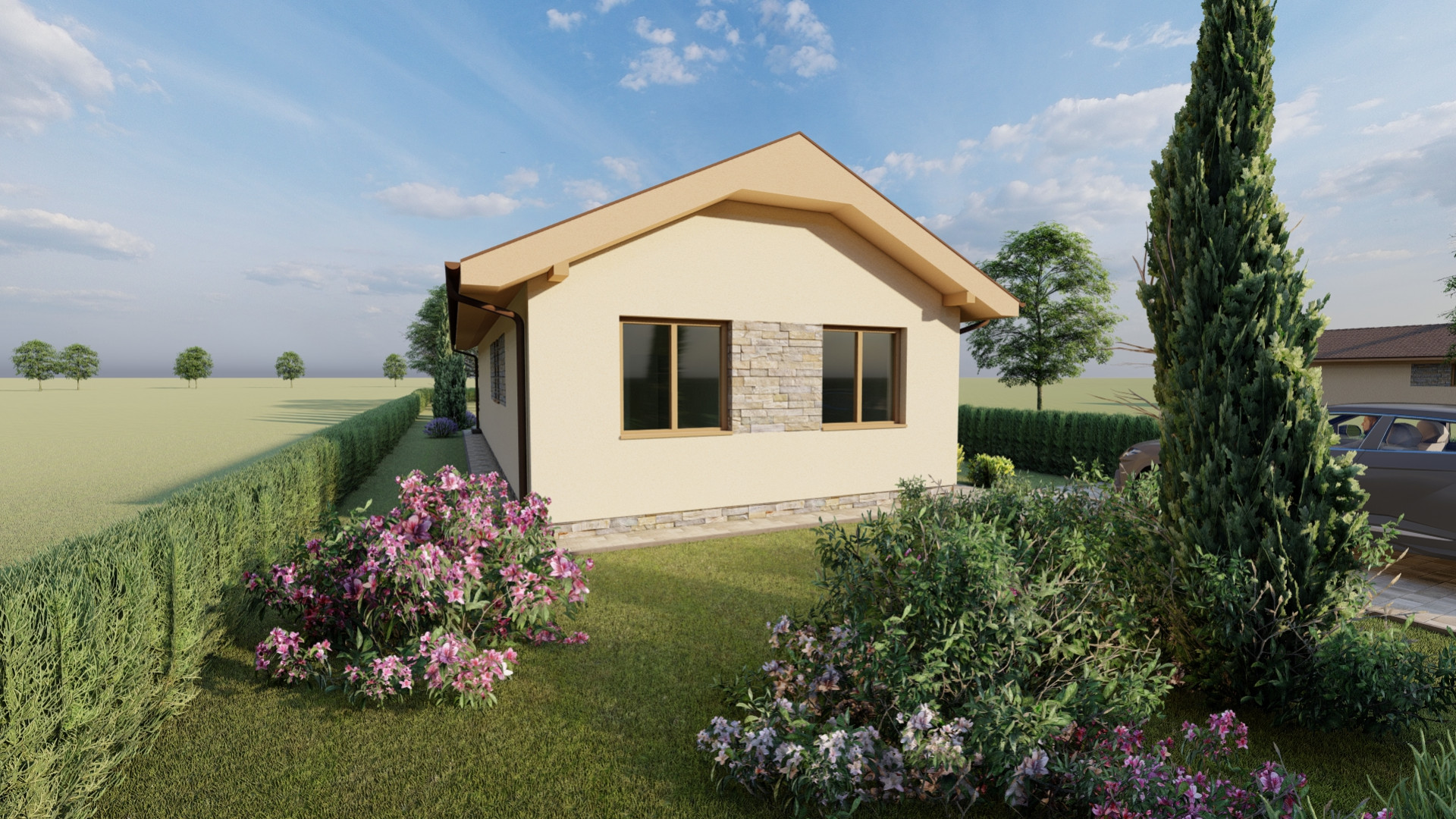 Jednoduchý malý prízemný rodinný dom určený prevažne na rovinatý terén, ktorý spĺňa nároky na bývanie pre troj až štvorčlennú rodinu. Kompaktný obdĺžnikový pôdorys s plnohodnotným príslušenstvom je vhodný aj na menšie pozemky. Hlavný vstup do rodinného domu je z bočnej strany, na ktorý nadvezuje zádverie a chodba. Verejnú časť tvorí presvetlená obývacia izba spojená s kuchyňou, a terasou. Súkromnú časť tvoria 2 obytné izby a kúpeľňa. Zastrešenie domu tvorí sedlová strecha so sklonom 25 stupňov.